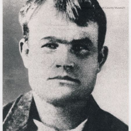 Black & white copy print of Butch Cassidy. He has straight hair parted on the right, dark eye brows & a square face. He wears a dark jacket & light colored button up shirt. This is a zoomed-in copy of his prison mugshot from the state penitentiary in Laramie in the 1890s.