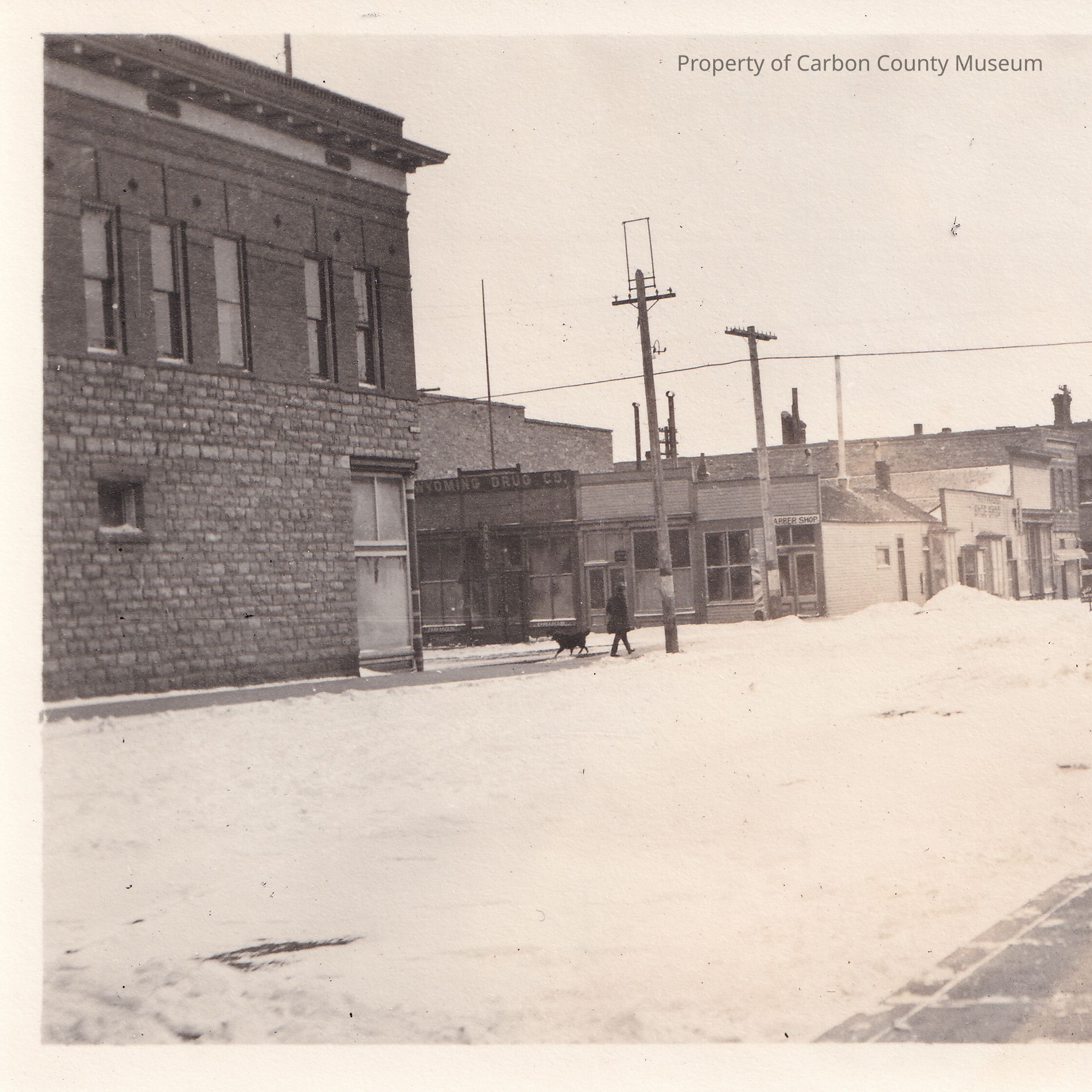 Two black and white snapshots of Rawlins 5th Street scene in the wintertime with heavy snow piles at various locations. Both views are taken on 5th Street looking South with the Railroad Hotel in the far distance. Photo a. shows the "Wyoming Drug Co." and "Barbershop" south of Cedar Street. The corner of the Ferguson Mercantile is at side left. A man and a black dog are seen at the corner of 5th and Cedar. Side right shows store fronts of the Osborne building in the distance.