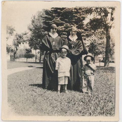 Black & white print of two nuns in full habit of dark long sleeve, floor length with hood & shawl dress & white collar. They also have a cross around their necks. Two small children stand in front of them. They appear to be boys wearing straw hats.
