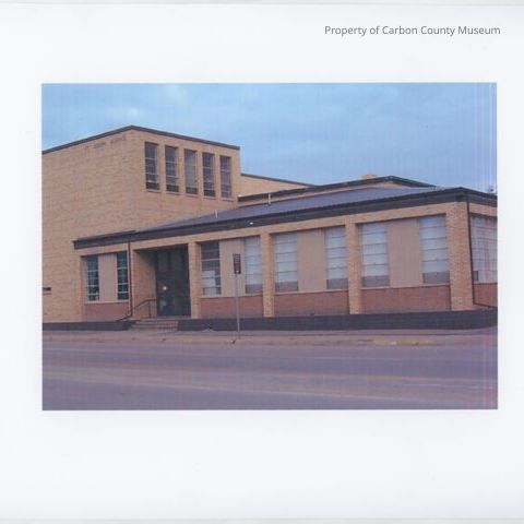Color scanned print of St. Joseph School. Photo left portion is two story brick with five windows on one side & "St. Joseph School" on the other. Lower level has two windows that are next to entrance on one level section. Section on right has many windows & angle roof up to a square top. black top street is in photo foreground. A wide sidewalk is next to building.