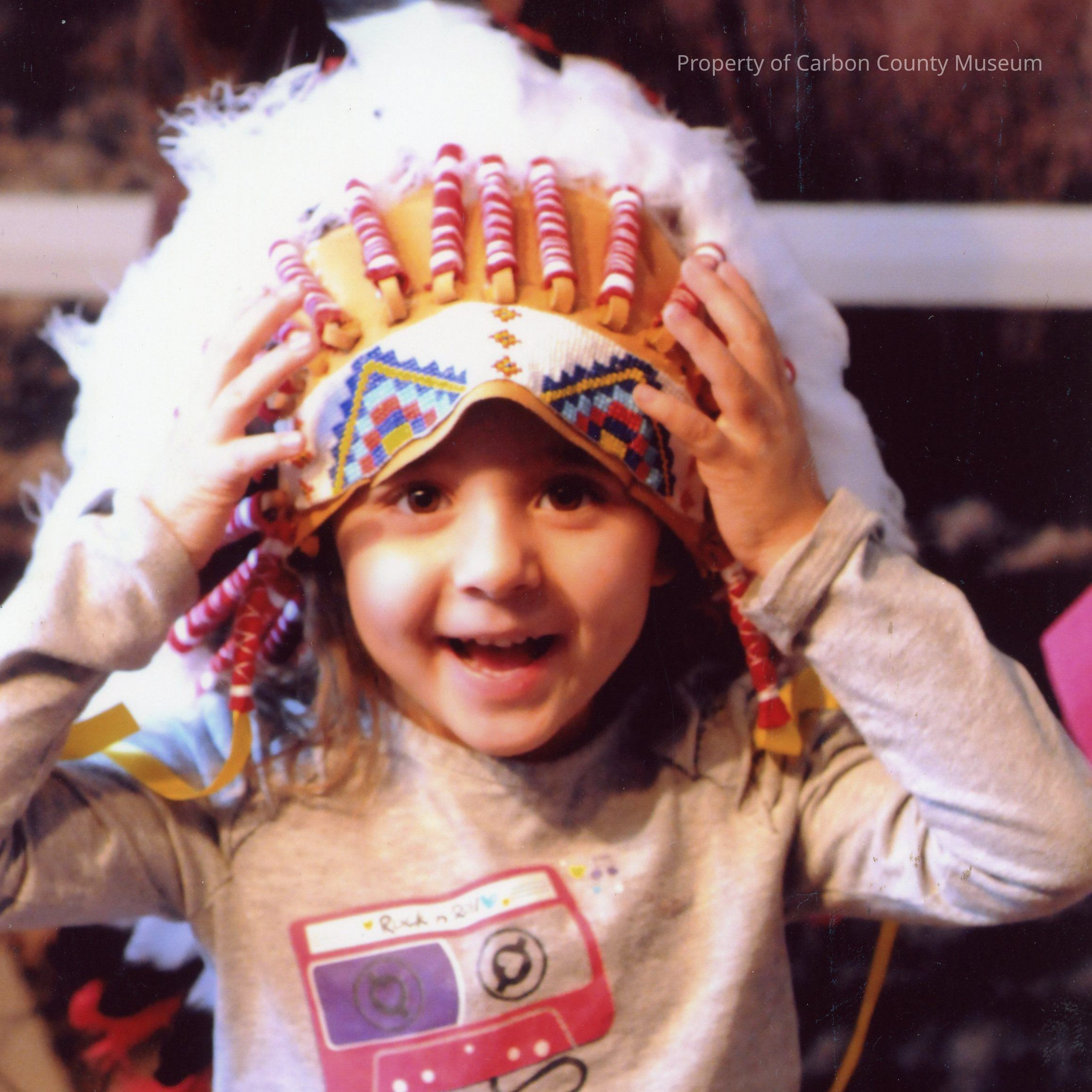Photograph of Julia Comstock, a young girll. She is wearing a Native American Indian headdress from the prop or education collection, with both hands holding it on her head. She wears a long sleved gray shirt with a picture of an audio casset with the tape coming out to say "Let's Rock".