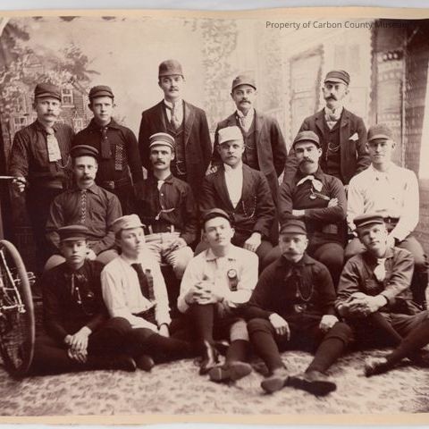 Sepia print. Studio portrait mounted on tan matboard. Image of a group of 10 men & bicycles posed in front of painted backdrop; carpet underneath & grass in foreground. Men are dressed in suits & ties; all but two are standing. Ten bicycles - most in group at right standing with men. Man at center is seated on a small stool? between front wheel of two bicycles; man just to his left is perched on the front wheel of two bicycles.