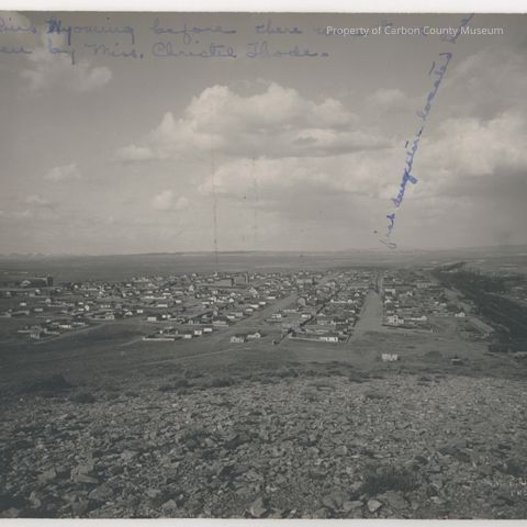 Written directly on emulsion on top: "Rawlins Wyoming before there were trees[.] Given by Miss. Christel Thode." [with an arrow pointing to a building right of center] "first drugstore located here".