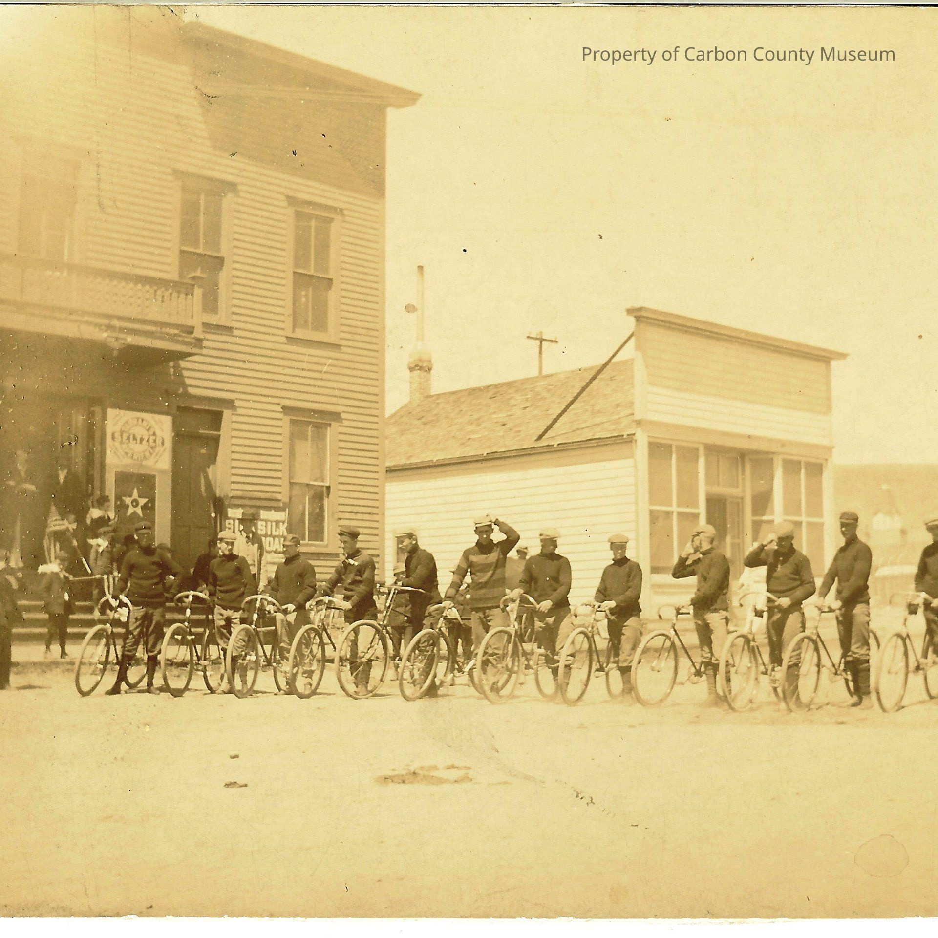 Copy 1: Written on back in pencil: "Rawlins, Wyo bicycle Club 1895 neg#10820 Carbon County Museum" In blue ink: "Picture taken in front of old Opera House which burned in the early 1900's. It was located on 5th Street & faced east. the small frame building in the picture was Dr. Osborne's office" Stamped in black" "Copy provided by the Wyoming State Archives & Historical Department"