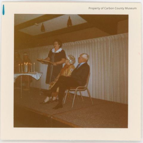 Print 1. Image of a standing woman holding unidentified object but possibly scrapbook described next. An older man & woman are seated to her left. On the table to her right are lit candles. Vague figures of girls are behind the table. A large drape is pulled behind them.
