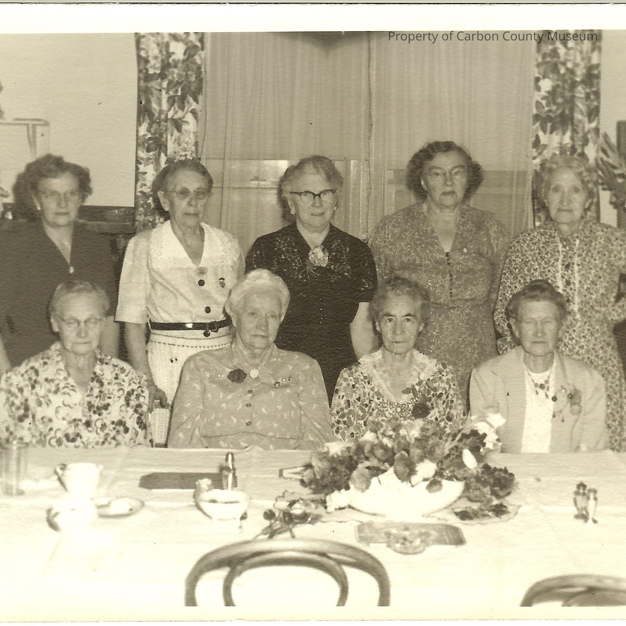 Black & white print of nine women sitting at & standing behind a table. Women are all dressed nicely & most of them are elderly. Table has a floral bouquet at a centerpiece & is covered with a cloth. Behind ladies is a window covered with sheers & at ends are large leaf drapes.