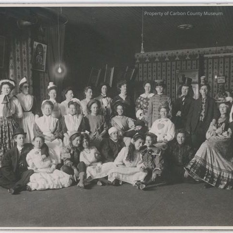 Black & white print on black mat of image of a group of women in costume posed on a stage with a home set.