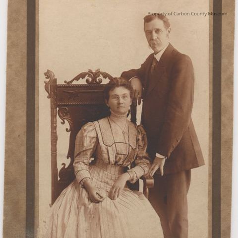Sepia print on brown mat of seated woman & standing man. She is seated in a large wood carved chair & she is wearing a stripe print long dress. The collar of dress is high around neck & is trimmed in lace. The bodice of dress is embroidered & has lace inset & cuffs match. She has dark hair & wears glasses. Man is wearing a dark tweed suit, print tie & white shirt. Print is bordered by dark brown line & mat is cut off so print is at an angle on mat.