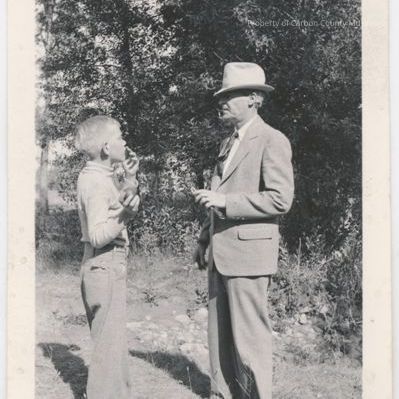 Black & white print of a young boy & a man. The young boy on photo left is holding a round object in his right hand & his left hand is at his mouth. He is facing the man who is wearing a suit & tie. Man is holding a long object in his left hand & has a long slender object sticking out of his lips. Trees are behind them & grass & rocks are on the ground.