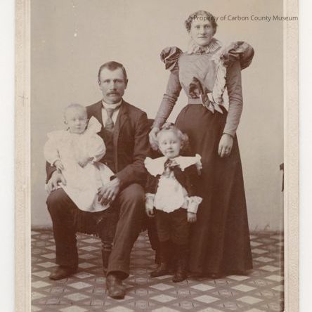 Written on back in black ink: "Louis Larsen holding Edith Larsen. Maren Larsen, Morris Larsen. Started Sheep business with brothers Jens and Ole in 1890."