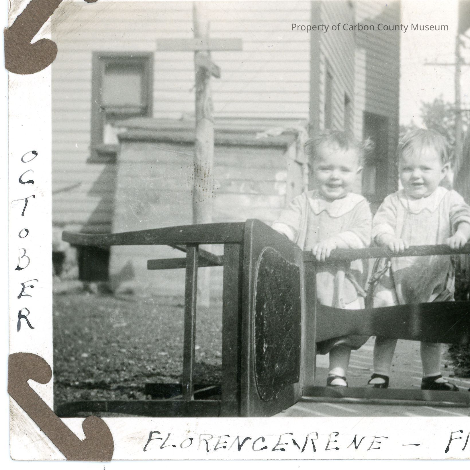 Black and white photograph. Two infants/toddlers are outside of a house, they are holding themselves up with the support of an overturned chair. Written along the top edge of the photograph is "BUFFALO N.Y.", written along the bottom edge is "FLORANCE - FRANCES GENE", written vertically along the left edge is "OCTOBER", and written vertically along the right edge is "1926". Written on the back in pencil is the following: