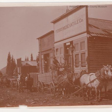 Black & white print of three teams of horses pulling three wagons setting on a dirt street. They are in front of two buildings with large glass windows. A sign above the inset door on photo right building says: "POST OFFICE". Above door on building flat false front is: "Ferris Mercantile Co." Dark building in photo center has two men standing on porch. A man is on each wagon holding the reins to horses. Another building is along street in distance. A light pole is on corner of porch & a bell on sign at Mercantile building.