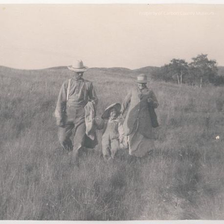 Update 2009: Black and white print of three people walking in a tall grass field with a few trees in photo right background. Man is dressed in pants, long sleeved shirt and suspenders. He has on a large brimmed light colored hat with dark band. He is carrying a light colored jacket draped over his left arm. He has a cigar in his mouth. To his left is a child dressed in bib overalls and large straw hat. To childs left is a lady dressed in a small plaid pattern long dress and solid color jacket. the jacket has buttons down the front and long sleeves. She has on a wide brim tall crowned hat. She is carrying a dark object under her left arm.