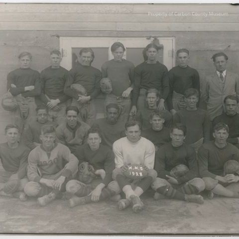 Written on back in black ink: "Hanna High School football Team - 1928" Top row: Reino Kouppala, John Crawford, Wayne E. Skelli, Harold Marchan, Oliver Salo, Kenneth Briggs, Coach(?) Middle row: Reinald Hunt, John Milliken, Lloyd Lockhart, Eugene Leivo, Armas Riva, Uno Hakla, Bottom row: Swante Aho, Joe Dickinson, Dan Clegg, Joe Jackson, Stanley Crank, Leonard Lucas Hanna High School Football Team-1928"
