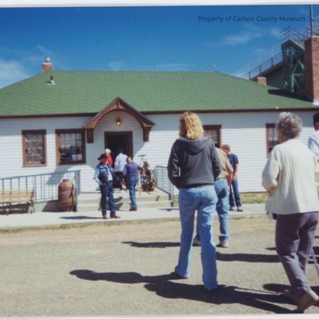 Two color prints of the Hanna Museum. It has a multi sided, green, shingled, roof with white clapboard sides & brown trim at windows & door. A chimney on roof is at corner on photo right. An entry cover of inverted "V" is over door & is trimmed in brown. A handicapped ramp is along front on photo left & steps are at front center. A bench is in front of railing beside ramp. People are walking toward the entrance. The highway overpass that crosses the railroad tracks is on photo right.