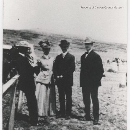 Rawlins Cemetery taken between 1903-1907. Decoration Day. Charles Cunningham hold a Mahoney child, Nell Tierney, Tom Ready and George Brimmer. Two copies.
