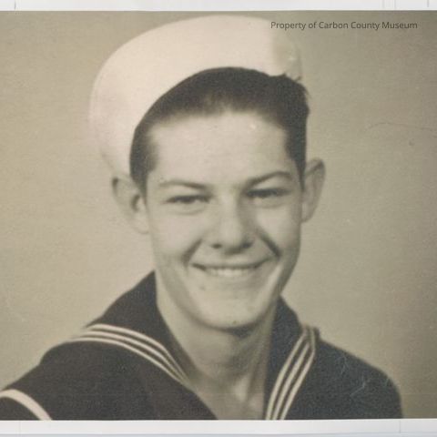 Black & white scanned copy of a young man in a sailor's uniform & cap. He has dark short hair & is smiling.