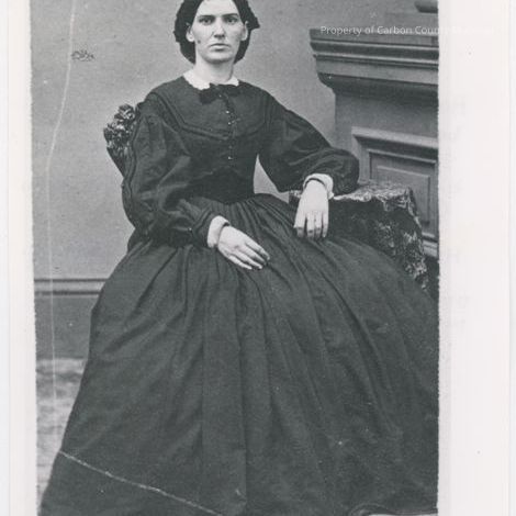 Written on back in black ink: "Harriett Ann (Way) Arthur (1st husband) Hawley born Jan 30, 1845 at Massillon, Stark Co., Ohio died - Feb 2, 1920, at Santa Rosa, California Husband #2 - William Mills Hawley. Photo copied from a calling card - probably between 1860 & 1868"