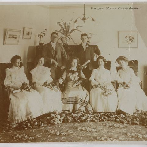Black & white print. Mounted on matboard. Image of a group of five women & two men posed inside a home. Women are all seated; four are wearing white dresses; one wearing a light colored dress with dark lace & stripe accents. Men are dressed in suits & standing behind the women's chairs. Piano in the corner of the room behind group; plants on top. Pictures on wall in background. Radiator on right background. Floral carpet. Bouquets of flowers on floor at the feet of the women. Women in white all holding rolled papers & flowers; man at center also has rolled paper in his hand.