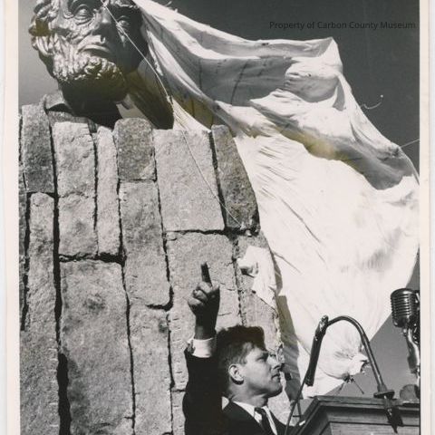 Black & white print of a bust of Abraham Lincoln above vertically placed rocks & a man speaking at a ceremony. A cloth covering is mostly blown form the bust. The man is holding his right arm outstretched & pointing with his index finger. There is a podium with a microphone mounted on top.
