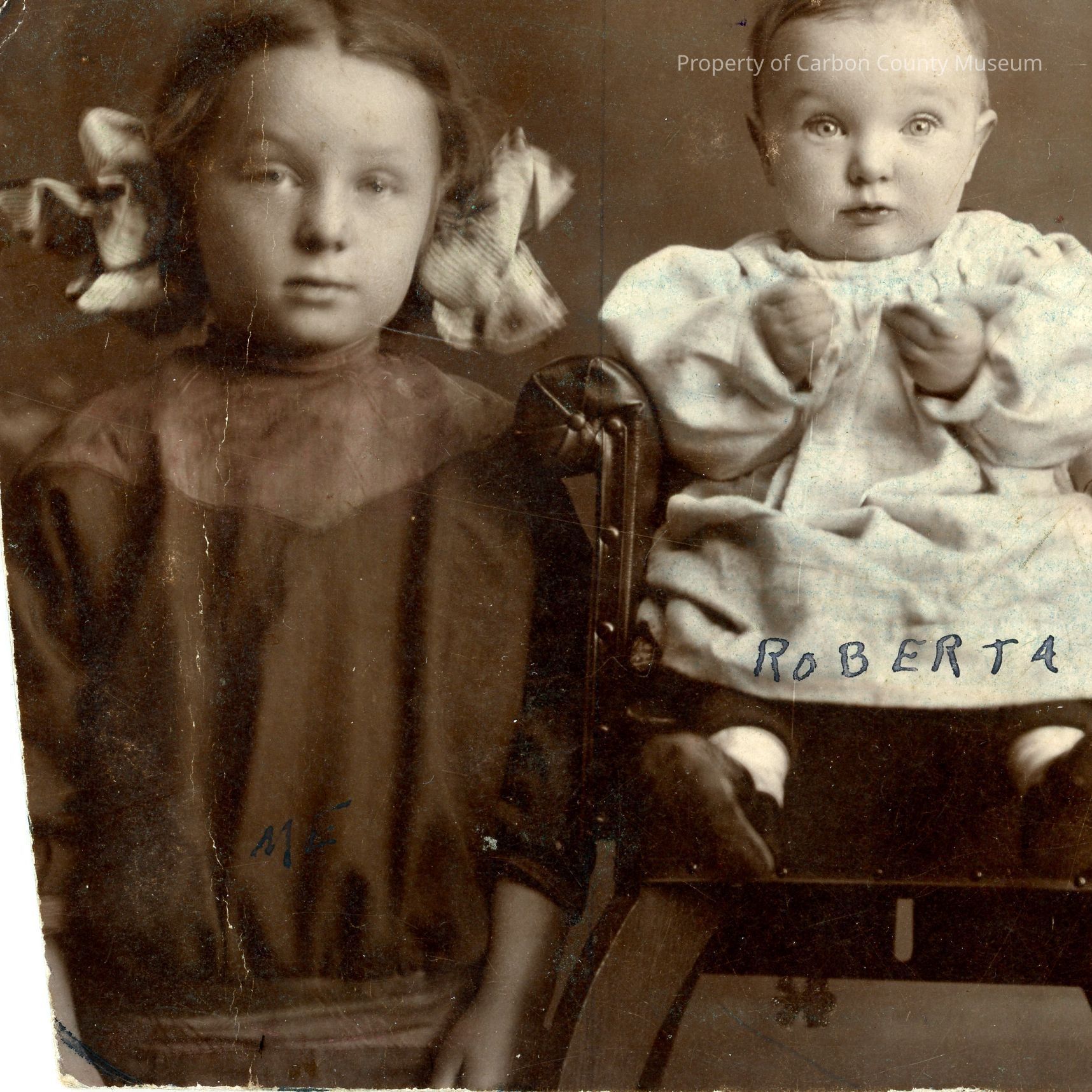Sepia tone photograph. In the center is an infant/toddler sitting in a chair, on the left is a young girl while on the right is a young boy. Written on the children reads from left to right "Me", "Roberta", "Gilbert". On the reverse the following is written in black ink: