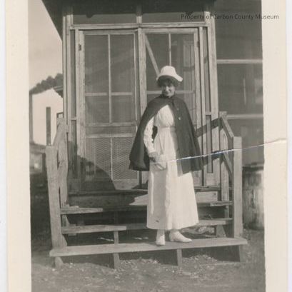 Black & white print of a woman dressed in a nurses uniform. She is standing on wood steps in front of a wood double screen door. The sides of steps have a wood rail on both sides. The woman is wearing a white ankle length full skirt, long sleeve white blouse tucked in at banded waist & a nurses cap. A dark colored cape is draped around her shoulders. Her right hand is in the front pocket of her skirt.