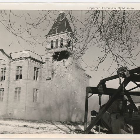Black & white print of demolition of the Old Central School. A hole has been created beneath the tower. Dust & debris is falling toward the ground. On photo right is a piece of machinery that is setting on the ground, it has large metal framing around an engine.
