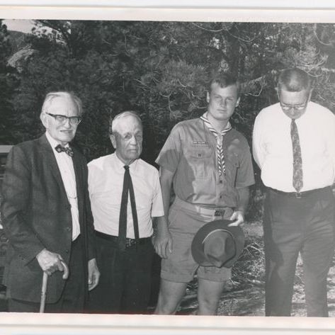 Black & white print of four men standing outside, man on left is elderly, wears a dark suit, white shirt & bow tie, had grey hair & glasses. Next man to right has dark slacks, white shirt & dark tie. Next a young man is scout uniform of shorts, shirt with badges, scarf & tie slide & a hat in his left hand. On right is a man in dark slacks, tie, white shirt, wearing glasses. His head is lowered toward his chin. A jeep is in the background on left.