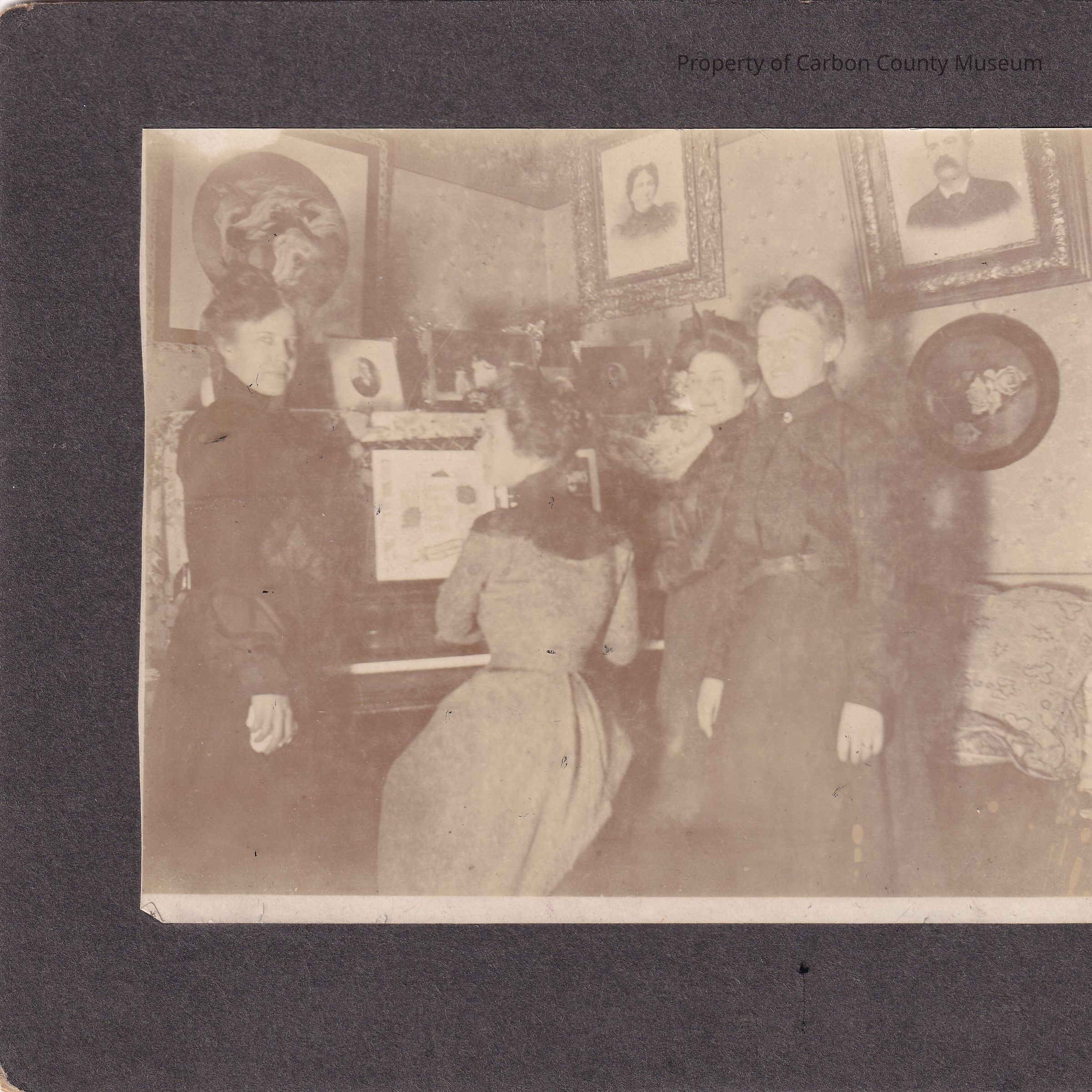 Sepia tone photograph glued to black backing. Photograph is of four woman, three are standing and looking at the camera while one is seated at a piano.