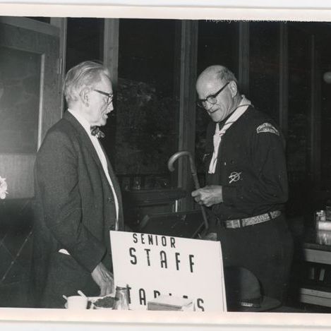 Black & white glossy print of two men facing each other. Man on right in black suit, bow tie & white shirt,. He wears glasses & has grey hair. Man on left is in dark scout uniform with patches. he has on a scarf with slide tie. He is holding a cane in right hand. He wears glasses & has thinning hair. Between them is a sign that says: "Senior Staff tables"