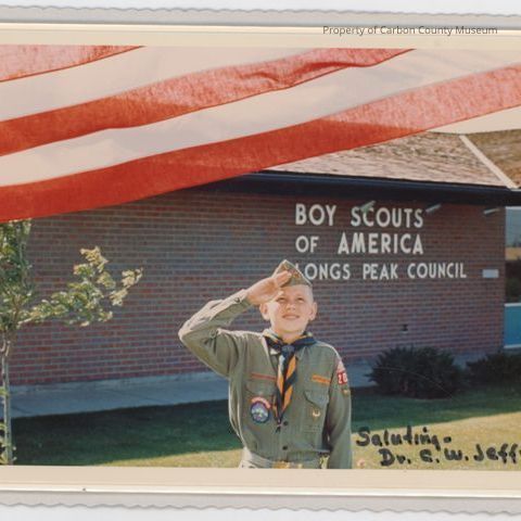 Color print in a folder of young boy scout in full uniform. He is saluting. Above his head flies a partially seen American flag. On the side of the building behind him is written: "Boy Scouts of America Long Peak council" The building is brick with glass windows & a door on side. A small tree on photo left & grass & bushes are next to building.