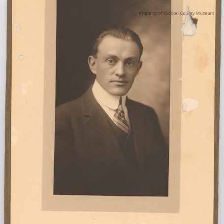 Black & white studio portrait in a brown folder of a young Dr. Jeffrey. He is wearing a dark three piece suit, white stiff high collar shirt & print tie with tie tack. Embossed on bottom right corner of print: "Roof(?) Chicago" Engraved in red on right folder flap: "Roof (?) Kimball Hall, Cor Wabash Ave & Jackson Blvd Chicago"