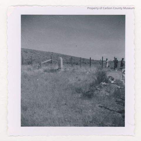 Update - May 2010: black & white print. Snapshot. Image of a cemetery with a fence in mid-ground & hill in background. Three people at right midground looking through the fence. Scalloped edges.