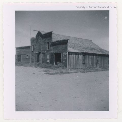 Update - May 2010: Black & white print. Snapshot. Image of a large frame building with a loft through center. Large lower doors & several windows; two windows & upper door at center front. Piled with weeds along foundation; dirt yard. Scalloped edges.