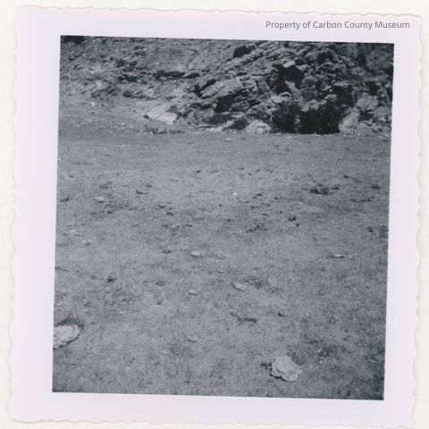 Update - May 2010: Black & white print. Snapshot. Image of dirt plain with rock wall in background. Scalloped edges.