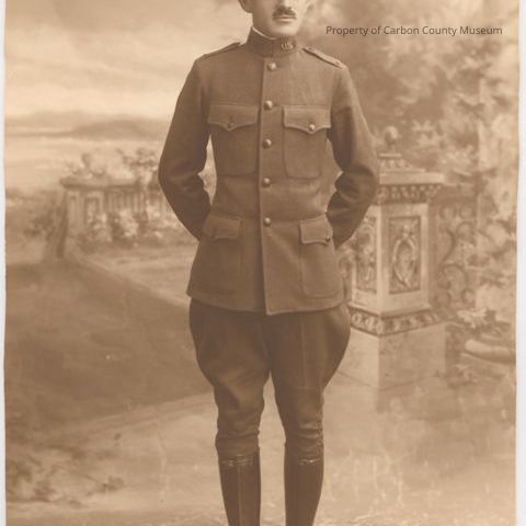 Black & white studio portrait of a man in military uniform. His arms are held behind his back & he has a mustache. His jacket has shoulder epaulet, a high collar, five buttons down the front, four large pockets with one button on flap. The pants are wide at the thigh & narrow at the knee with four buttons on the outside at the knee. Leather wraps surround his leg from the knee down to the ankle. His shoes are leather &lace & tops are under the gators. His hat has a short bill, tall crown with military insignia & flat round top.