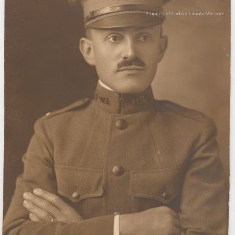 Two studio portraits of Dr. Charles W. Jeffrey in military uniform. His hands are folded across his chest & a ring is on the third finger of his left hand. He has a mustache. The uniform has shoulder epaulets, high collar with "U S" on the left side, buttons down the front with two chest pockets. The hat has a short bill, high crown with military insignia & flat round top.