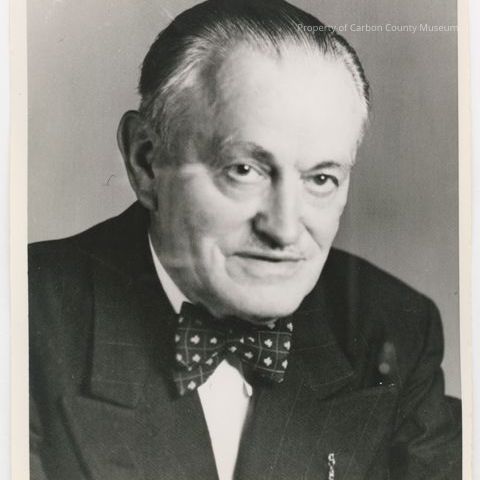 Two black & white studio portraits of an older Dr. Jeffrey. He is wearing a dark suit jacket, white shirt & print bow tie. His hair is combed back & he has a slight mustache.