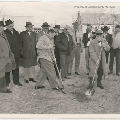 Stamped on the back in black: "Professional Photo Services Apr 10 '63 Frank J Meyers Rawlins, Wyo." In pencil: "(Dr Jeffrey - right w/shovel)"