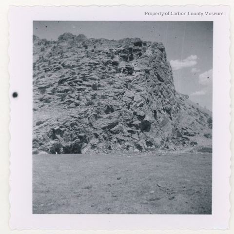 Update - May 2010: black & white print. Snapshot. Image of a rocky hillside with dirt prairie in foreground. Scalloped edges.