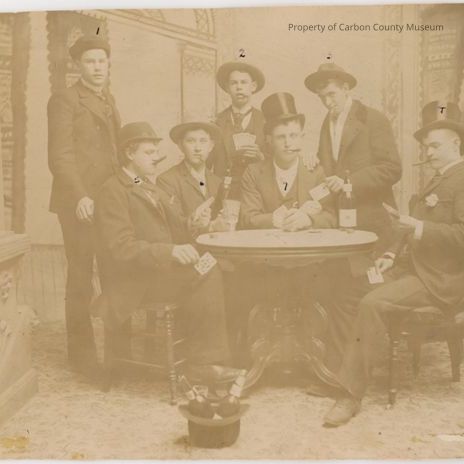 Sepia print on cream mat & two copies Print is a studio shot with painted scenery background of trellises and draperies and wall borders On left is a large pilaster with large urn on top base. Center of print shows a group of young men sitting and standing around a center support based round table smoking cigars, playing cards, wearing hats (two wearing black top hats) bottles of liquor in an upside down dark hat in the foreground. A bottle of liquor is sitting on table at right and a young man is holding a dark bottle of liquor on side left with two crystal goblets nearby him on table. Some of the men have numbers or letters written above their heads in pencil. Man in center has a sheriff's type badge peeking out from behind his coat attached to vest. Some men are showing cards in their hand under the table. In blue ink numbers "1-7" are above their heads.