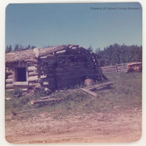 Update - May 2010: Color print. Snapshot. Image of an old log cabin with a sod roof. Corral fence & machinery in midground; heavy forestation in background. Metal junk & logs beside structure. Dirt track in foreground.