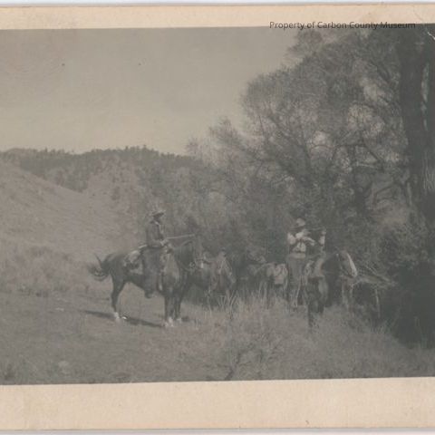 Black & white print card that has the right side cut down. Image of two men on horseback holding rifles. Man on right has his left leg over horse's neck & is aiming his rifle toward the trees. Another saddled horse is between other two horses. Hills & trees are in the background.