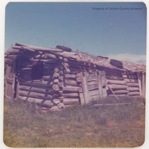Update - May 2010: Color print. Snapshot. Image of an old log structure with sod roof; tires and barbwire on roof. Grassy yard.