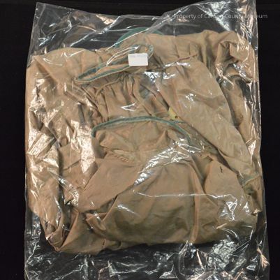 Update 2010: Beige silk fabric with matching cumberbund. Four leaf clover embossed. Turquoise colored velvet piping at cuffs, collar & belt. Left in bag for conservation purposes.Collection