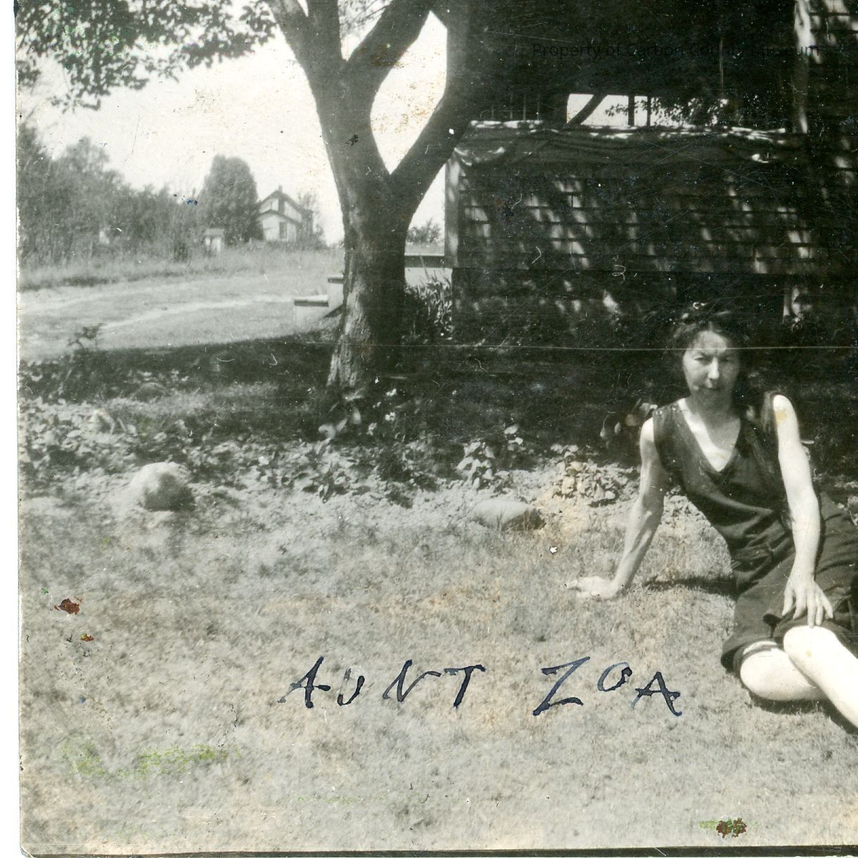 Small black and white photograph. A woman is sitting down in the yard of a house. Written beside the woman is "AUNT ZOA". Writing on the back of the photograph in black ink reads "Auntie Zoe Santa Monica California Taken in 1922". Writing in blue ink reads "Zoe Sherrod Huntington wife of Albert Huntington".Collection