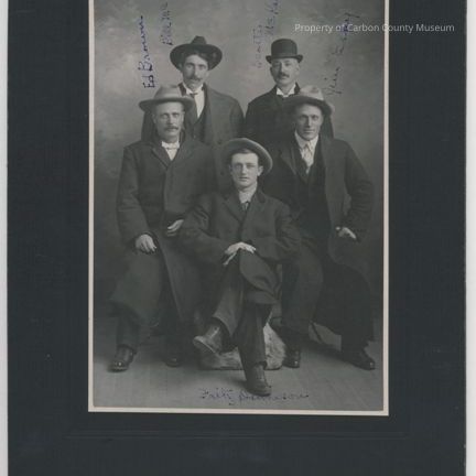Written in blue ink identifying each man [from left clockwise]: "Ed Brown Bill McPherson Scotty McKay Jim Espy Fritz Dennison".