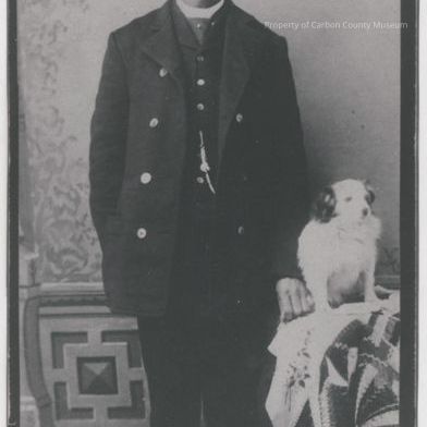 Black & white scanned copy of a man standing beside a table with a dog on table. The man is wearing a dark, three piece suit, dark tie & white shirt. He has a watch fob & chain attached to his vest &his double breasted jacket is unbuttoned & open. The man has dark hair parted on the left & a large mustache. His left hand rests on the table next to the dog. The dog is a small, light colored with dark ears & sitting down on back legs with front legs upright. Table is covered with quilted cloth.