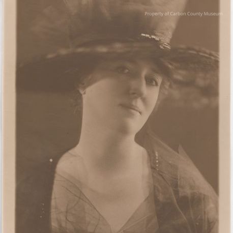 Sepia studio print of elaborately dressed woman. She has a large hat with wide brim & rolled upright mesh crown & rhinestones for trim. Her dress is dark with rhinestones near the shoulder with an overlay of mesh on shoulders & across front. On bottom right corner: "Mishkui, NY"