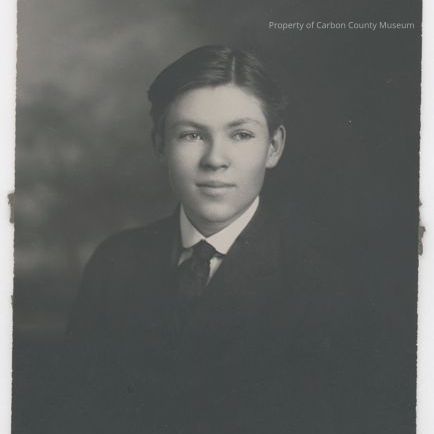 Black & white studio print of a young man dressed in a dark suit & tie & white shirt. His hair is dark & parted on the left side.